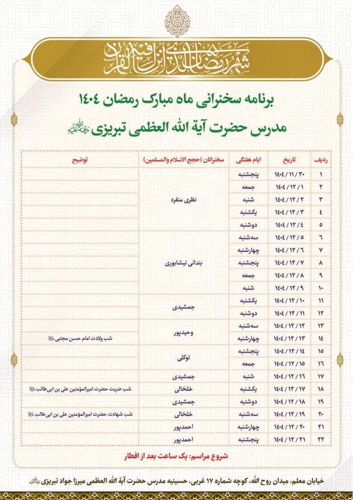خانه/slider/برنامه سخنرانی ماه مبارک رمضان ۱۴۰۴ برنامه سخنرانی ماه مبارک رمضان ۱۴۰۴ سلسله دروس دفاع از اعتقادات شیعه اثنی عشری اشتراک گذاری فیسبوک ایکس لینکداین تامبلر پینتریست Reddit VKontakte Odnoklassniki پاکت اشتراک گذاری با ایمیل چاپ